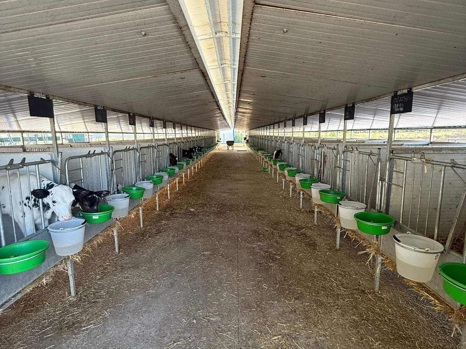• Box svezzamento vitelli rialzato in batteria a file contrapposte, in evidenza una copertura più alta che sormonta la batteria di fronte, cancellino con due secchi semplici senza cattura